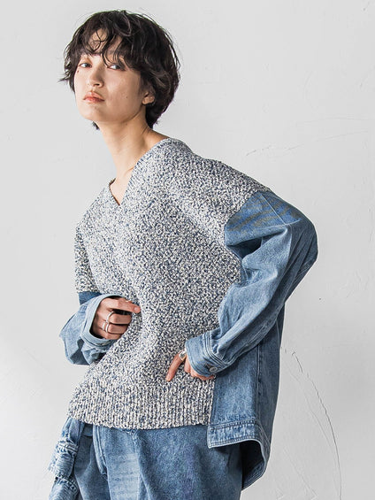 デニムドッキングVネックニットプルオーバー≪洗濯機で洗える≫