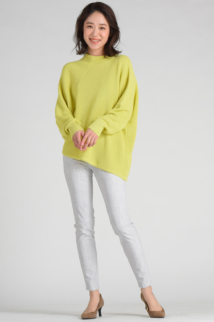 トップスをカラーニットにしたときには、ボトムをパンツにして甘くなりすぎないようにするのが大人流の着こなし方。パンツスタイルで全身の印象を引き締めれば、大人世代が避けがちなパステルカラーでも挑戦しやすくなります。明るいカラーのトップスは顔色も明るくしてくれるので、暗くなりがちな車内の中にぴったり。パッと明るい肌がキープできます。