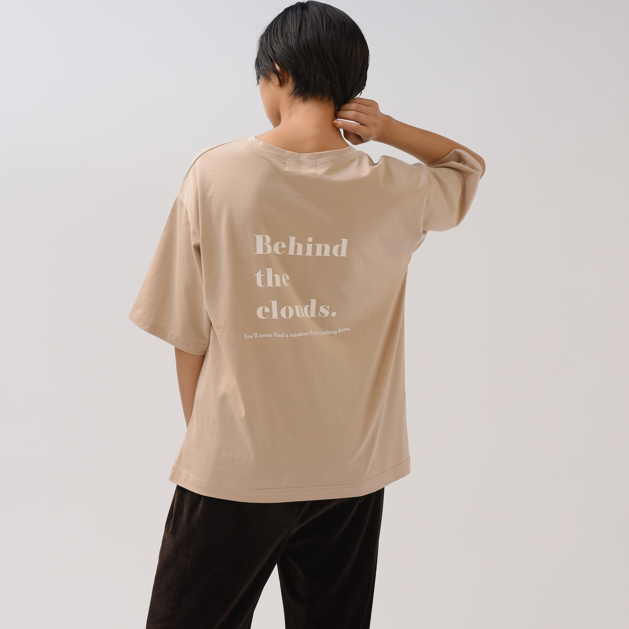 フロントではなく、あえてバックにデザイン性のあるTシャツを選ぶと、こなれ感がアップ。