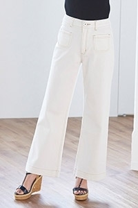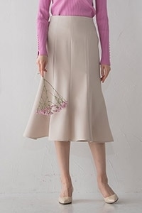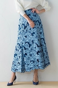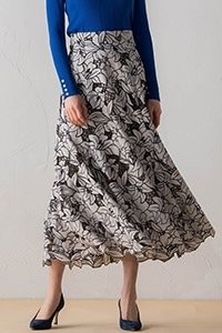 咲き誇る花々の輪郭を刺繍で表現した花柄フレアスカートは、生地や裾にカットワークを施しているのがこだわり。ハイウエスト&ひざ下丈なので、スタイルアップして見えるのもうれしいポイント。短めのトップスを合わせたり、裾をウエストINして着たりすることで、より美脚見えが叶います。ホワイトのリブトップス、ネイビーのパンプス合わせで爽やかに決めて。