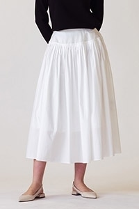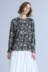 淡く繊細なボタニカルフラワー柄のブラウスは、肩にコンパクトなギャザーを入れることで華奢な印象に。ダークグレーがベースになっているから、甘い印象になりすぎず着られます。裾をボトムスにINして着ても、外に出しても着られる丈感なのが好印象。フェミニンな雰囲気を楽しみたいときは、ふわりと広がるギャザースカートを合わせて。