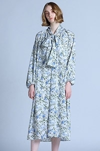 大きめのボウタイが女性らしいワンピースは、外国風のフローラルプリントが印象的。白、ブルーなどの爽やかなカラーリングが、軽やかで上品な印象を演出してくれます。1枚で着るのはもちろん、肌寒い日にはカーディガンをレイヤードしても◎。共布のベルトでウエストをブラウジングすれば、よりフェミニンな雰囲気で着られます。