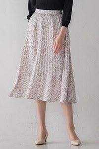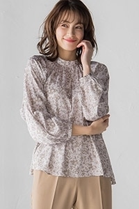 フェミニンなコーデを楽しみたいときは、ベージュの花柄アイテムで優しい雰囲気に仕上げて。同じ柄のトップス&スカートは、セットアップ使いでワンピース風にも着られるのが魅力。胸元のギャザーやスカートのプリーツ加工で、より華やかな印象に仕上がります。主張しすぎない花柄なので、お出かけからビジネスシーンまで活躍してくれること間違いなしです。