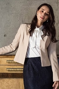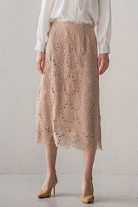 トップスとスカートには、同じ花柄のケミカルレースをあしらって華やかに。トップスはボリューミィな袖が大人可愛く、おしゃれに着こなしやすい短めの丈感です。上下ともにたっぷりと花柄レースを使用しているけれど、ベージュカラーのおかげで品よくエレガントにまとまります。アクセントに赤のパンプスを合わせ、とことんレディなスタイルに。