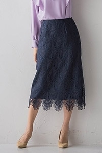 華やかな花柄レーススカートも、ネイビーならこんなに落ち着いた印象に。裾のレース部分が歩くたびに揺れ、エレガントな印象を与えてくれます。トップスもダークカラーでまとめたら、ベージュのノーカラージャケット&パンプスで軽やかな印象をプラス。レースや色使いで、落ち着きつつも重くなりすぎない花柄コーデに仕上がります。