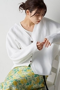 淡い色同士のコーデは春らしくて良いけれど、どこか新鮮味が欲しい……というときは、黒のカーディガンで引き締めてみて。マーガレット柄をジャガード織りで表現したカーデは、細い糸で編み上げることでコンパクトなシルエットを実現。着ぶくれの心配なくすっきりと着られます。そのまま羽織るのはもちろん、ウエストをリボンベルトでブラウジングするのもおすすめ。