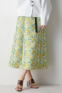 ジャガード織りで花柄を表現したスカートは、ポコポコとした立体感が楽しめるのが魅力。暖かい季節にぴったりなイエロー&グリーンで、明るい印象のコーデに。長めの丈感で大人っぽく着られるのもポイントです。トップスには袖や後ろ身頃に丸みを持たせたニットカーディガンを合わせ、大人可愛いカジュアルスタイルに。サンダルや黒のベルトでアクセントを加えて。