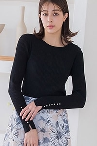 線画調の花柄が優美な印象のスカートには、シンプル&コンパクトなトップスが相性抜群。袖のボタンがアクセントになった黒ニットは、体に程よくフィットするシルエットが女性らしい印象。スカートのゆるやかなAラインが、エレガントな雰囲気を演出してくれます。レディなコーデにはヒールパンプスを合わせ、足元までぬかりなく仕上げて。