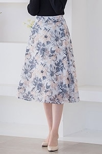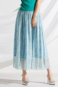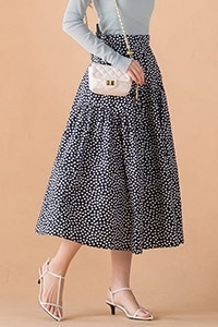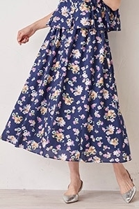 さりげない花柄が可愛い小花柄スカートは、ギャザー使いやふんわり広がるフレアシルエットが女性らしい雰囲気。ネイビーを基調としているので、コーデを選ばず活躍してくれそう。今年トレンドのシアーなトップスを合わせれば、品の良いきれいめスタイルに。大人っぽく着こなすには、バッグや小物をワントーンでまとめてみて。