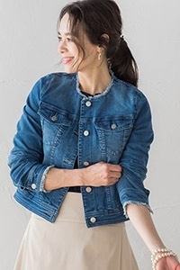 少し肌寒い日に活躍してくれるデニムジャケットは、コーデに程よいカジュアル感をプラスしてくれるアイテムでもあります。コンパクトなシルエットやノーカラー仕様、襟・袖口のフリンジなど、女性らしいディティールもたっぷり。大柄の花柄スカートに合わせれば、休日のお出かけやショッピングにもぴったりなきれいめカジュアルスタイルに。イエローのバッグで、春らしさを添えて。