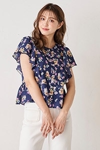 カラフルな花柄を施したトップス&スカートは、セットアップとして着ることでワンピース風に。ネイビーベースなので子どもっぽくならず、大人の女性でも着やすい雰囲気が魅力です。トップスの肩のフリルやスカートのフレアシルエットが、華やかさをいっそう引き立てます。シルバーのヒールパンプスでシャープさをプラスし、きれいめにまとめて。