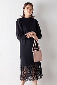 ニットワンピースは、涼しくなってくる秋口から重宝するアイテム。袖部分と裾に華やかな花柄レースを施しているから、これ1枚でシンプルすぎず華やかな花柄コーデが完成します。足元は黒のパンプスでシックにしつつ、やわらかなピンクのバッグを差し色に。お仕事にもお出かけにも活躍してくれるから、ぜひコーデに取り入れてみて。