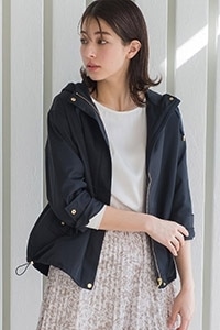 風が少し冷たくなってきたら、コーデに羽織ものを投入する時期。ネイビーのマウンテンパーカーは、ゴールドのパーツ使いやコンパクトなサイズ感が◎。カジュアルになりすぎず、きれいめに着られるのが魅力です。シンプルなニットやブラウス、花柄スカートとの相性も抜群です。小物を黒で統一すれば、より大人っぽい印象のコーデに。
