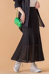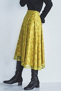 イエローの花柄レースが目を惹くスカートは、アシメデザインでモードな雰囲気。レースを使いつつも甘すぎないスタイルが楽しめます。トップスにオーバーサイズなパーカーを合わせれば、大人の遊び心あふれるカジュアルスタイルが完成。足元にロングブーツを合わせれば、トレンド感のある冬コーデに。真冬にはニットやボアアウターを合わせても素敵です。
