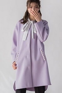 ポケット口のパールが印象的なノーカラーコートは、軽くあたたかな素材で作られていて着心地も抜群。より華やかに着こなすなら、ブルーの花柄スカートを合わせてチラ見せするのがおすすめ。スカートの花柄でよりフェミニンなコーデに仕上がります。コートとスカートにカラーアイテムを使う分、トップスやブーツはシンプルにまとめ、引き算をするのがコツ。