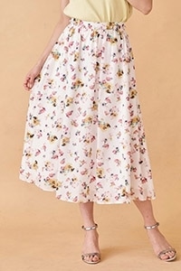 花柄トップスを主役にしたコーデは、淡い線画調のフラワープリントや、肩回りの大きめのフリルが優しい雰囲気。ブラウスには程よい透け感があり、軽い着心地がスプリングシーズンにもぴったりです。淡いベージュのマーメイドスカートでまとめれば、心躍るような春の花柄コーデが完成。足元はベージュパンプスで上品に仕上げて。
