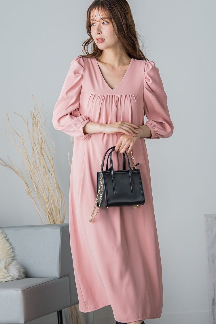 秋冬らしい深みのあるカーキグリーンが印象的なワンピースは、とろみ素材&Vネックが大人っぽい印象。ボリュームスリーブも韓国っぽさがあってかわいいです。冬らしいファーのハットを合わせれば、冬の始まりにもぴったりの韓国コーデに。小物類は黒で統一し、大人っぽく仕上げて。