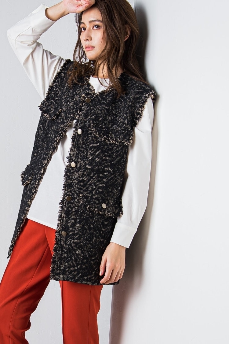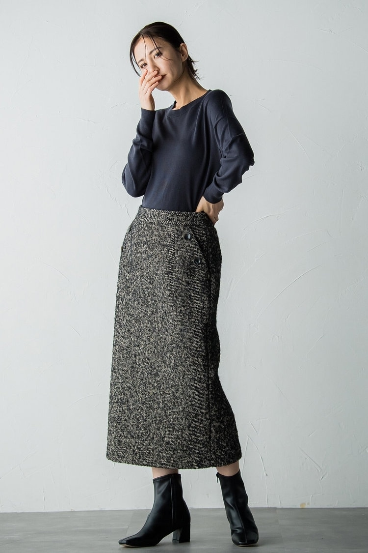 ボアツイードのベストをコーデのポイントにした冬のオルチャンコーデは、カジュアルながらも華やかな雰囲気が楽しめるのが魅力。クラシカルな印象ですが、インナーにカーキのワンピースを合わせることで上品さ&カジュアル感がミックスされてこなれたスタイリングに。足元もソックス&パンプスで品よく仕上げて。