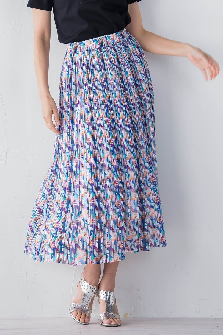 細かなプリーツがエレガントなスカート派、青、オレンジ、ピンク、白のカラフルな幾何学柄がかわいい!着るだけでとっても元気な気分になれそう。裾に向かってプリーツを消した“消しプリーツ”仕様だから、歩くたびにふわりと揺れる優雅なシルエットが楽しめます。フェミニンにも着られるスカートだけれど、夏はTシャツ合わせでカジュアルダウンして着るのもおすすめ。黒のTシャツなら、大人の女性らしいカジュアルスタイルが楽しめます。かごバッグ&サンダルや大きめのフープピアスで、思いっきり夏らしいスタイリングを楽しんで。