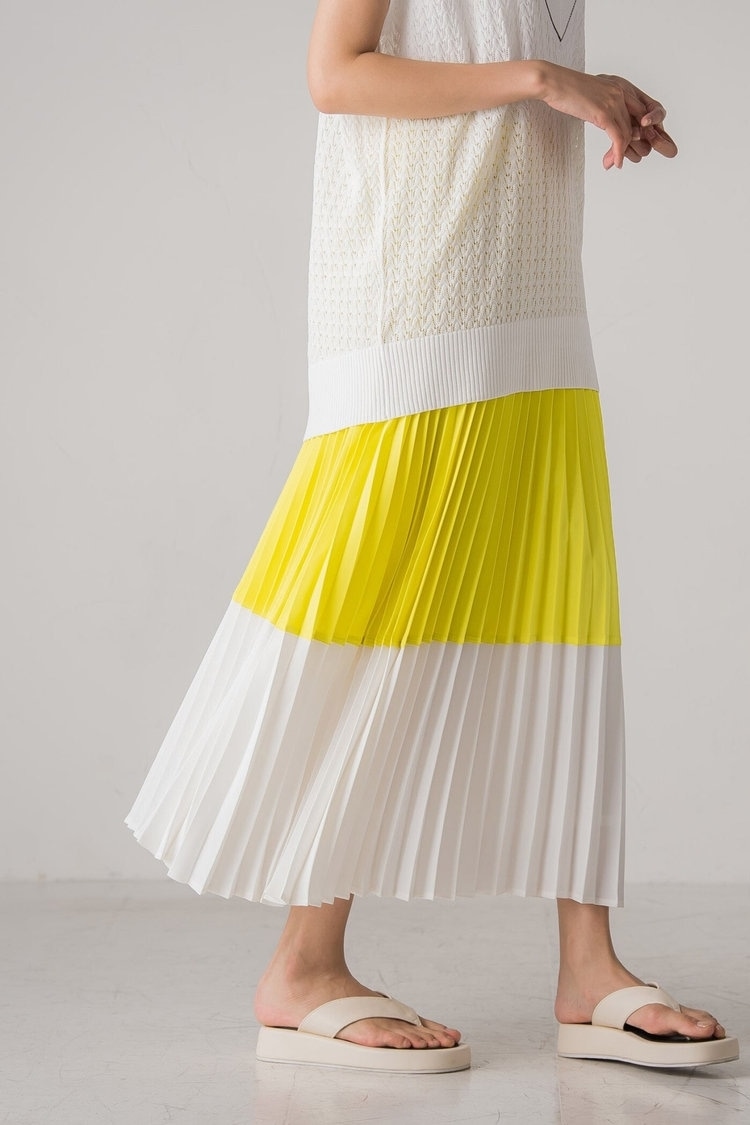 透け感が夏らしいホワイトのニットベストに合わせたのは、イエロー×ホワイトのバイカラーデザインがかわいいプリーツスカート。プリーツの幅が細めなので、カラフルながらも大人っぽく着られます。裾に向かって広がるフレアデザインやたっぷりの分量感が美しく、大人が上品に着こなせる仕立てなのもうれしいポイント。ニットベストはインナーを変えることで春から秋口まで着られるので、着回し力もばつぐん。春ならブラウスや薄手のデニムシャツ合わせもおすすめです。夏場のコーデでは白いサンダルを合わせ、全体的にクリーンで軽い雰囲気に仕上げてみて。