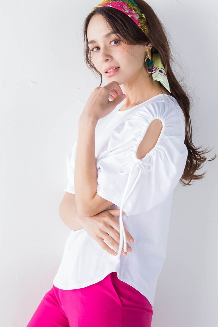 明るめの幾何学柄が着映えするプリーツスカートには、明るい色のトップスがよく似合います。トップス選びの際は、スカートの柄の色とトップスの色をリンクさせるのがこなれ見えのコツ。二の腕部分のさりげない肌見せデザインが、女性らしい雰囲気づくりに一役買ってくれます。スタイルアップして見せたいときは、トップスの裾をインした着こなしが◎。ウエスト位置が高く見えて、脚長効果がばつぐんです。足元はストラップの細いぺたんこサンダルを合わせ、大人の余裕を感じさせるリラクシーなスタイリングに仕上げてみて。
