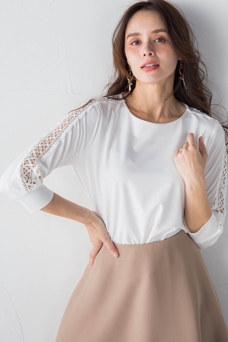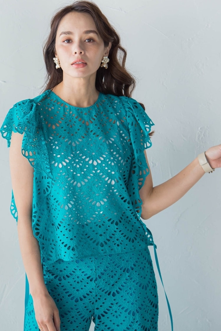 肩から胸元をぐるりと囲むようなレースデザインが印象的なトップスには、シフォン素材のマーメイドスカートを合わせて。歩くたびにふわりと揺れるシルエット、夏の空に映えるスカイブルーが、爽やかで女性らしい雰囲気を演出してくれます。足元はシルバーのカッティングパンプスで、ひとさじのスパイスを効かせて。