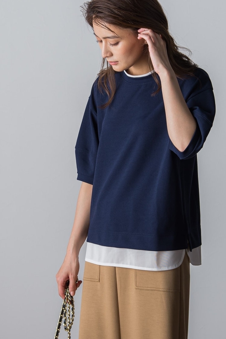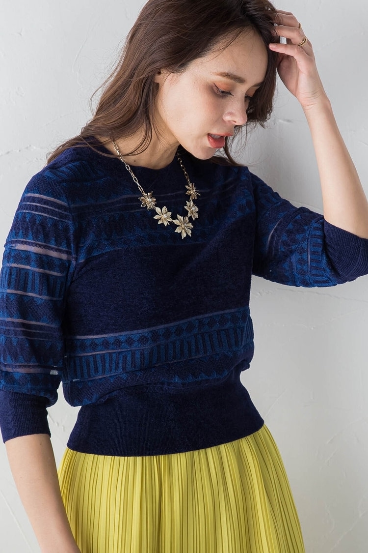 春らしいコーデを楽しみたいときは、ベーシックなネイビー×イエローの差し色で明るい雰囲気に仕上げてみて。ネイビーのトップスは、透け感のある糸で織った生地とモール刺繍がおしゃれ。シアー感があるから、春らしく重くない雰囲気の着こなしが楽しめます。ボトムスにはイエローのプリーツスカートで軽さと明るさをプラス。細かなプリーツがエレガント&クラシカルな印象で、カジュアルになりすぎず着られます。春から夏の変わり目には、華奢なサンダル&PVC素材のクリアバッグで、ちょっぴり夏を想像させる着こなしをするとおしゃれです。