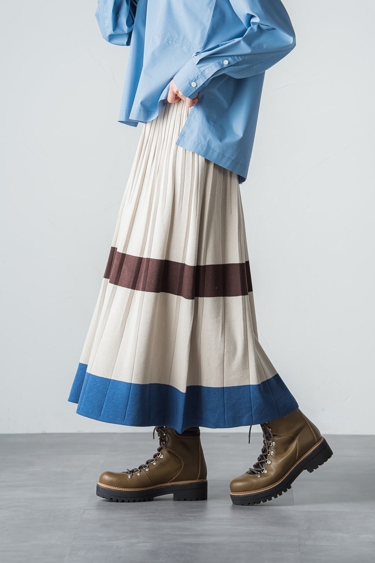 秋冬らしいニット素材で仕立てたプリーツスカートは、配色ラインがアクセントに。目を引くデザインだから、通り一辺倒なコーデになりません。肉厚な素材で自然な広がりが出るようデザインされているので、大人っぽい印象で着られます。やわらかで落ち着いたイエロー、ベージュ、ネイビーのカラーリングは、秋冬のダークカラートップスとも好相性。秋の始まりには、レイヤードデザインのネイビートップスを合わせて落ち着いたコーデを楽しむのがおすすめ。小物には黒のレザーバッグ&シューズを合わせるのが、大人っぽいカジュアルスタイルに仕上げるコツ。