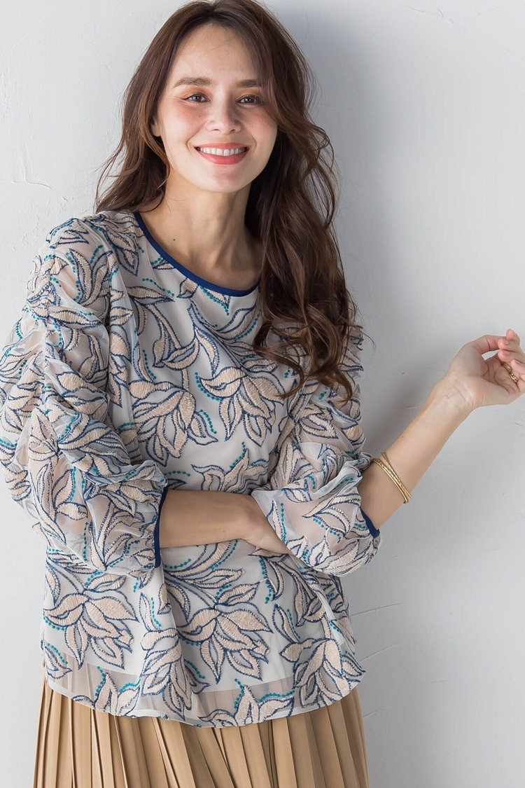 ベージュは季節を問わず使いやすいカラー。もちろん、秋冬コーデに取り入れるのもおすすめです。キャメル寄りのベージュプリーツスカートなら、落ち着き感もありつつ重くなりすぎない秋冬コーデが楽しめます。そんな今年の秋冬コーデは「モール刺繍」のアイテムに注目が集まりそう。トップスとして着たリリー柄のブラウスは、フラワー部分にもこもこした刺繍を施しているのが特徴。柄そのものが立体的で、存在感もたっぷりです。生地部分にはシアーな素材を使うことで、より女性らしい雰囲気に。秋らしいエレガントな着こなしを楽しんでみて。