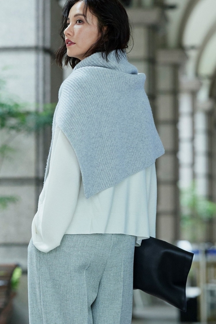 プリーツスカートコーデがどこか物足りない……と感じたら、トレンドの「ショルダーウォーマー」を足してみるのがおすすめ。アシンメトリー仕様になっており、シャツやニット、コートなどの上からストール感覚でつけるだけで、一気にこなれたスタイリングに。ハイネック仕様になっていて、ネックを折りこむことで好みのネックデザインにできるのも◎。おしゃれさはもちろん、肌寒い日の防寒グッズとしてもぴったりです。