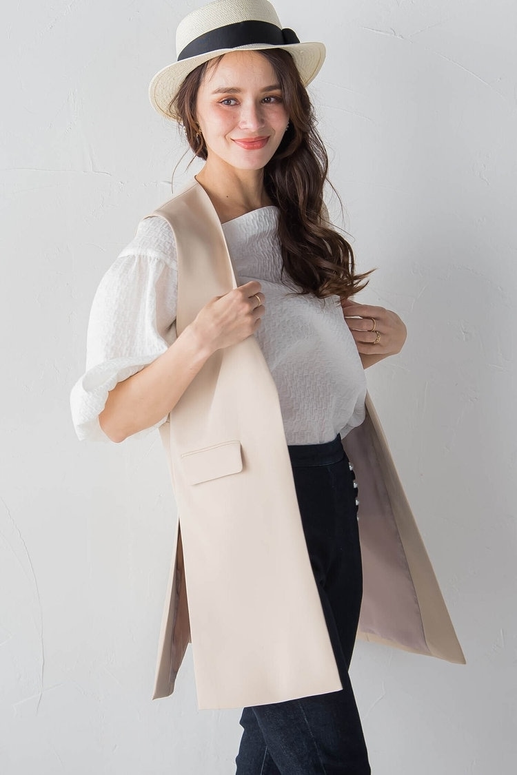 鮮やかなターコイズブルーが夏らしいプリーツスカートは、シルクのような品のよい質感が楽しめる逸品。広がりすぎないシルエットで、可愛らしくなりすぎず大人のフェミニンコーデが楽しめます。ウエストゴムで履きやすいのもうれしいポイントです。トップスは白で爽やかにまとめたら、ミディ丈のジレをON。ジレのきちんと感とちょっぴりハンサムな雰囲気が、コーデにスパイスを加えてくれます。小物類はかごバッグ、サンダル、ストローハットなど夏らしさを感じるものを選んで。春から夏、夏から秋の季節の変わり目にもおすすめのコーデです。