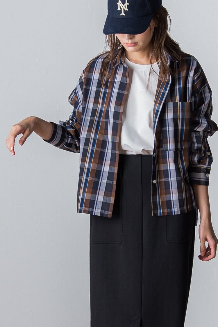 ブルー、白、ブラウンの爽やかなカラーでつくる秋冬コーデは、ニットのプリーツスカートをメインに。トップスは密度の高いブルーのブラウスをチョイス。前後差のあるデザインで、フロント部分はすっきりスタイル良く見せられるのもうれしいポイントです。スカートは腰から太ももにかけて細かいプリーツが入っているデザインで、ふわっとした広がりを感じるのが特徴。ブラウン&ブルーのラインが、コーデのアクセントになってくれます。スカートのラインと同じブラウンのワークブーツを合わせれば、一気に秋冬らしい雰囲気のコーデが完成。