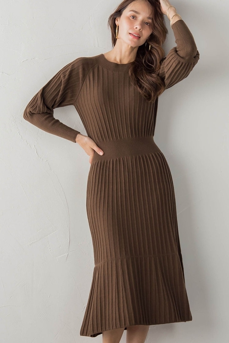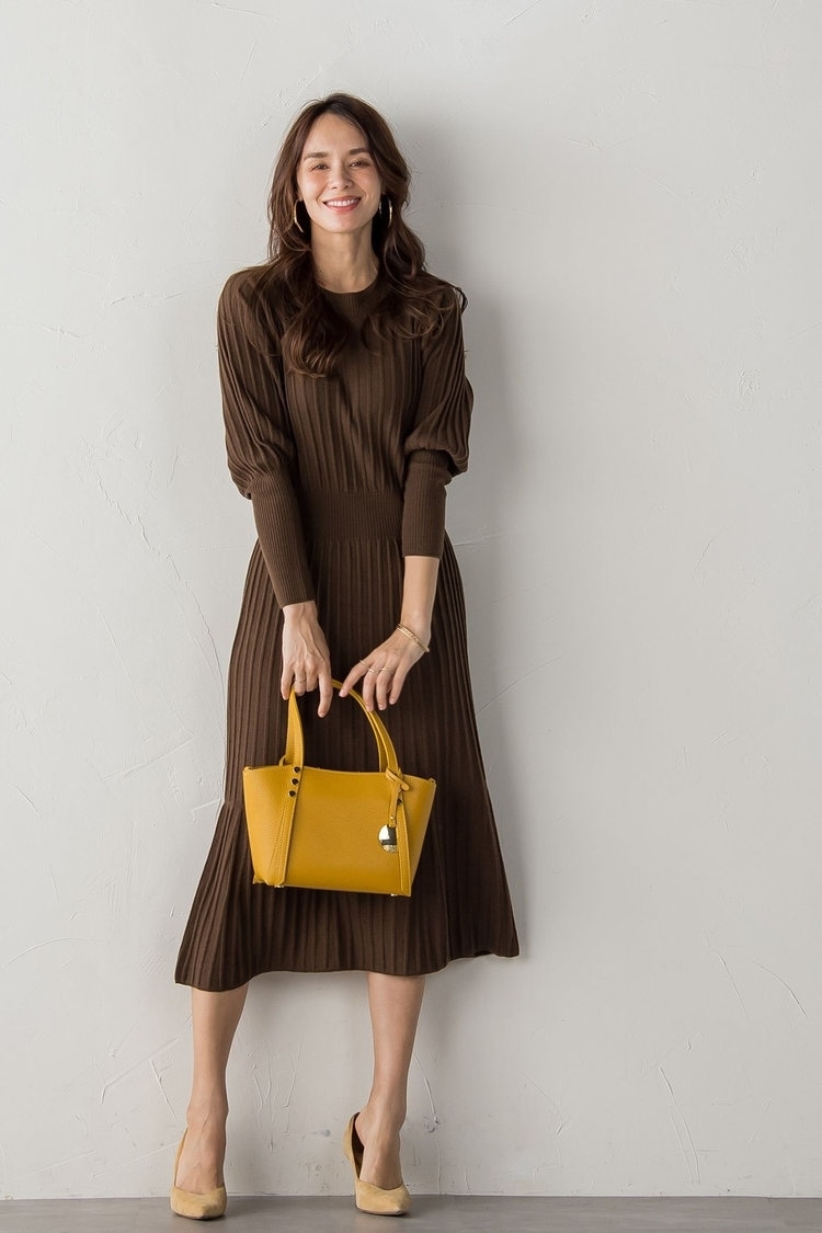 トップス&スカートのワンツーコーデに飽きたら、エレガントな雰囲気のワンピースを選ぶのもおすすめ!ウールニットのワンピースは、ハイネックの詰まった首元とパフデザインのスリーブがポイント。縦ラインの編み地とウエストがリブできゅっと見せてくれるのでよりスタイルアップ効果があるのもうれしいポイントです。ブラウンのカラーリングで秋らしさと品のよさを両立でき、プライベートからお仕事まで幅広く使えます。ヒールシューズやレディな雰囲気のバッグを合わせて、エレガントなコーデに仕上げて。