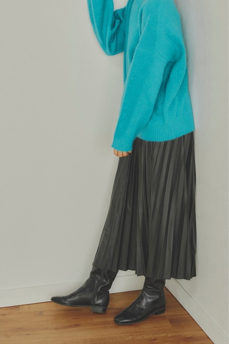 シフォンなどの軽い素材もいいけれど、秋冬ならエコレザー素材のプリーツスカートもおすすめ。エコレザーならではの重厚感ある大人っぽい雰囲気で、秋冬の厚手トップスにもベストマッチ。カジュアルな装いを楽しみたいときは、抜け感のあるカーキを選んでみて。レザースカートにはジップアップのトップスを選べば、かっちりしすぎない大人のカジュアルスタイルが楽しめます。袖部分のケーブルデザインがかわいく、コーデのさりげないポイントに。ボトムスが重めな印象なので、トップスには淡い色を選ぶとバランスよくまとまります。
