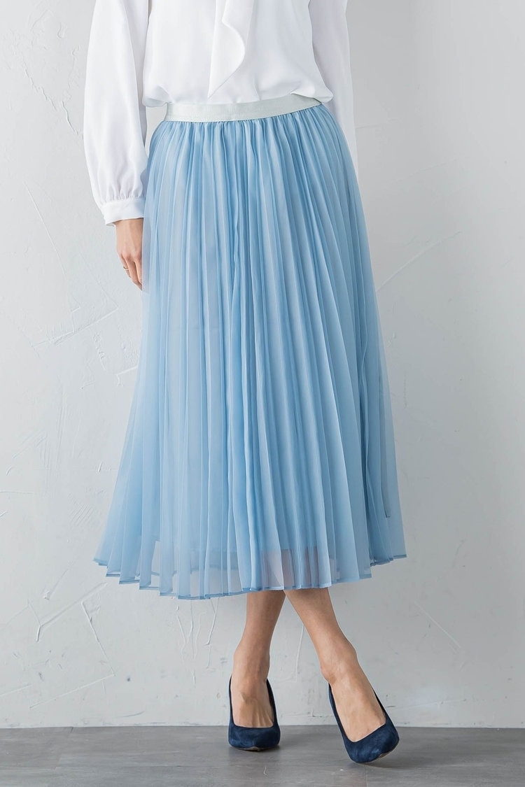 春夏にぴったりなブルーのプリーツスカートを使ったコーデ。軽やかでシアーな素材を使ったプリーツスカートは、裾に向かって広がっているので、動く度にふわっと揺れて、とてもエレガントに映ります。歩くたびに揺れるシルエットが美しく、大人のカジュアルスタイルを品よく見せてくれます。明るいブルーには、ホワイトのトップスが好相性。春先のちょっと冷える日には、ジャケットを羽織って防寒対策もばっちり。グリーンや白と相性のよいネイビーを選べば、女性らしくも凛とした大人コーデに。足元はトップスと同系色のサンダルでまとめて。
