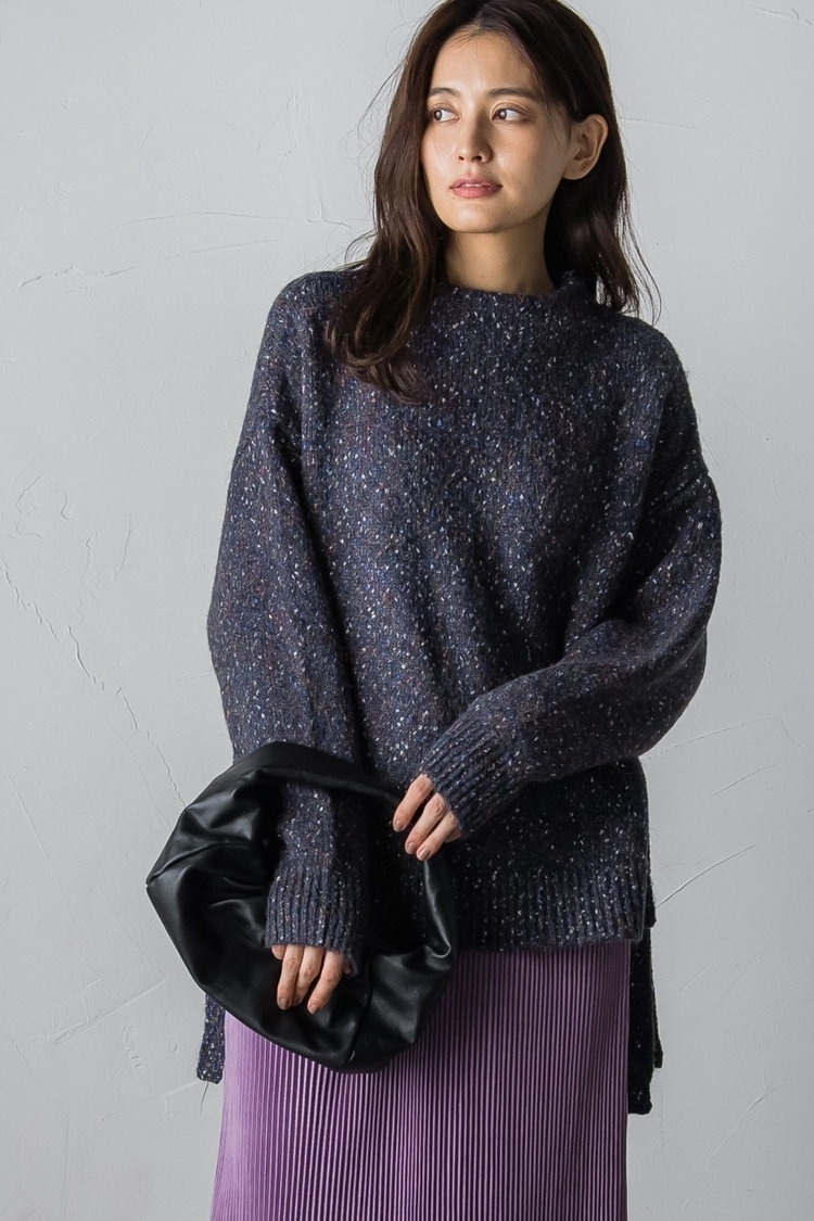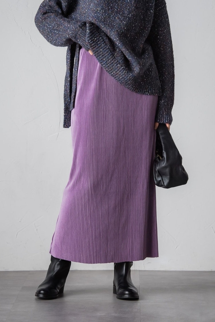 秋冬に登場回数が多いモノトーンやブラウン、ネイビーにぜひ合わせたいカラーが「くすみパープル」。淡いパープルより大人っぽく、くすんだカラーが落ち着いた印象に見せてくれるから、大人女子にぴったりなんです。カジュアルなスタイリングが好きな人は、ラフなトップスにもよく合うベロア素材のIラインプリーツスカートを選んでみて。シンプルで飾らない雰囲気が、ミックス糸のこなれ感あるニットにもマッチ。子どもっぽくならないよう、小物は黒のレザーバッグ&ブーツで印象を引き締めるのがポイントです。