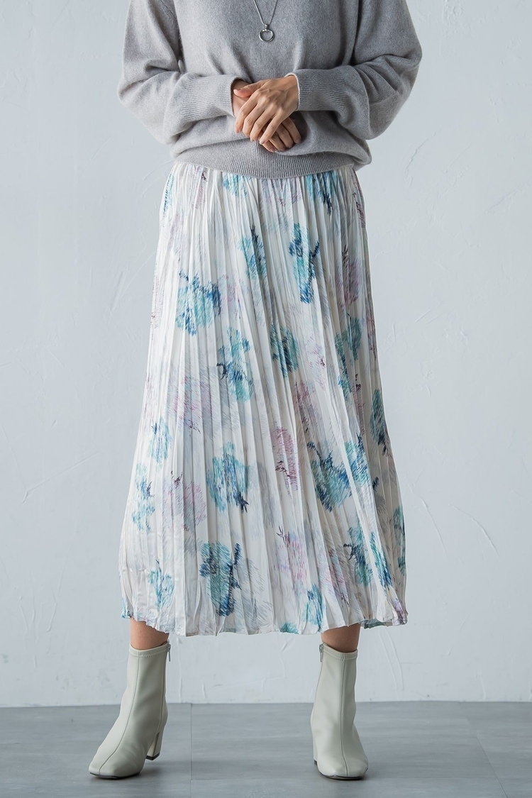 華やかなぼかしフラワーが目を惹く秋冬プリーツスカートコーデ