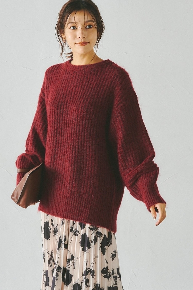 秋冬にまずトライしたいのが、赤ニットを使ったコーデ。トップスに着た赤ニットは、身頃がタイトなリブ編みに、袖部分はボリューミィに仕立てたメリハリシルエットが印象的。首周りはスクエアニットでデコルテがキレイに見えるのもうれしいポイントです。ボトムスにはボタンデザインが印象的なワイドパンツを合わせ、脚長効果を狙って。レザーのブーツ&ミニバッグを合わせれば、大人女子にぴったりな秋のカジュアルコーデが完成します。