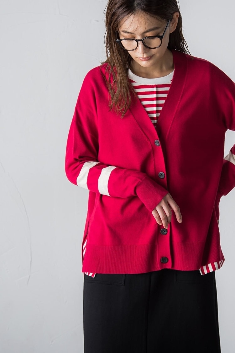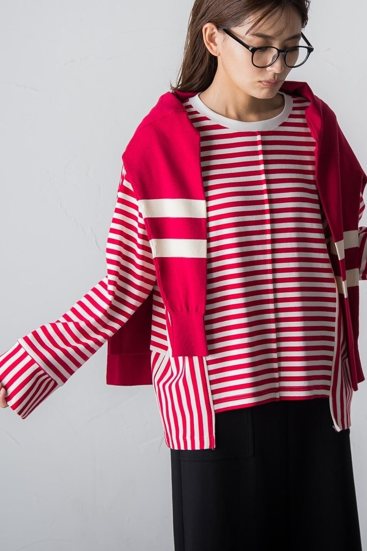 トップスの赤ボーダープルオーバーは、クレイジーパターンで仕立てられていて遊び心たっぷり。これ1枚でもコーデが決まるけれど、より新鮮な着こなしを楽しみたいときは赤のカーデを肩掛けし、アクセントをプラスしてみて。インパクトのあるトップスには、シンプルな黒スカートを合わせてメリハリをつけるのがおしゃれ見えのポイント。色数を絞ることでちぐはぐな印象に見えるのを回避できます。サイドゴアブーツも黒で統一し、あくまでもトップスを主役に仕立てて。