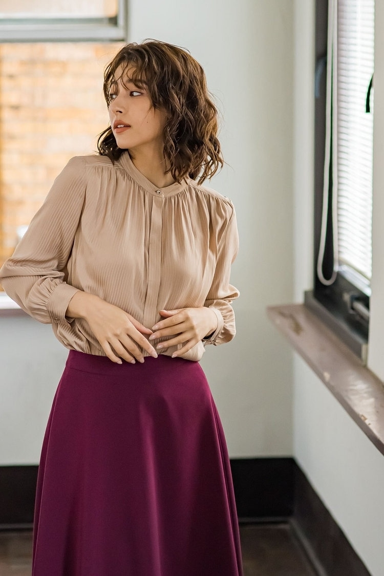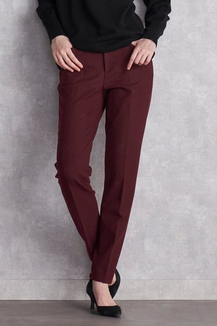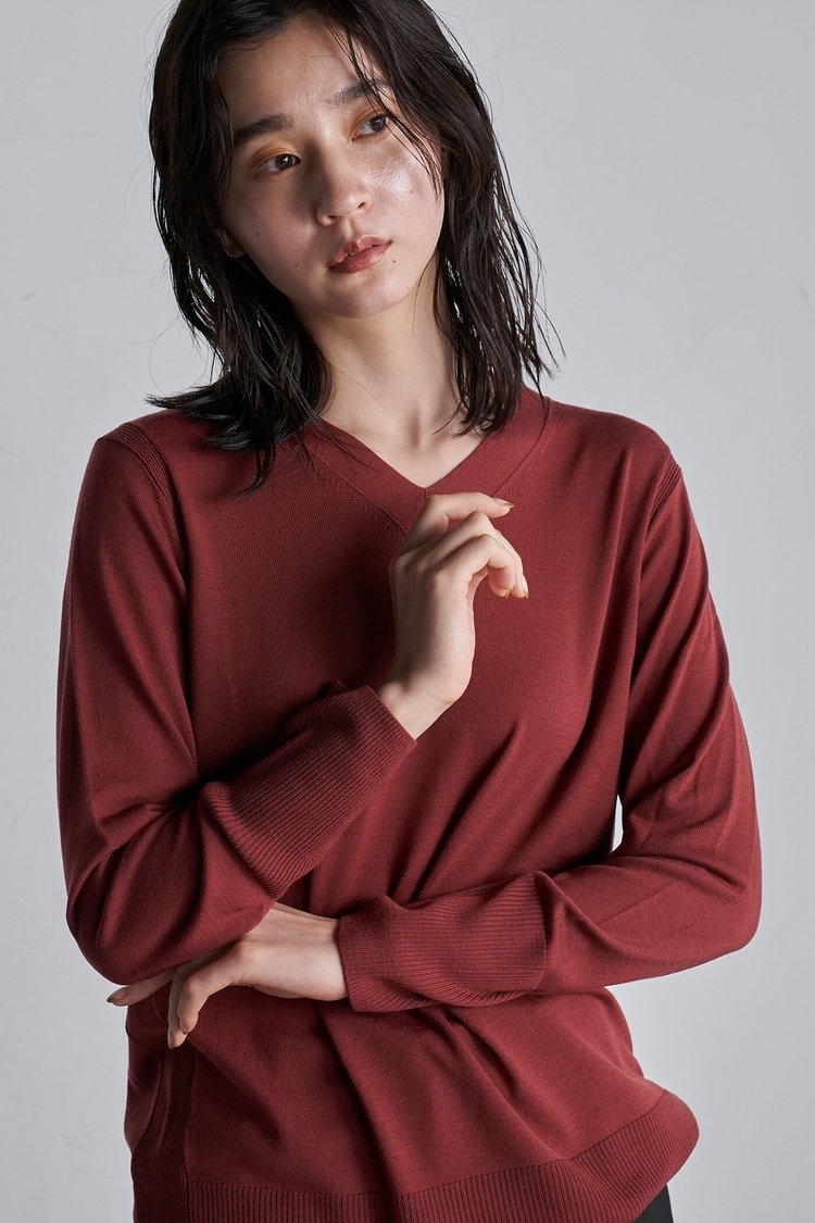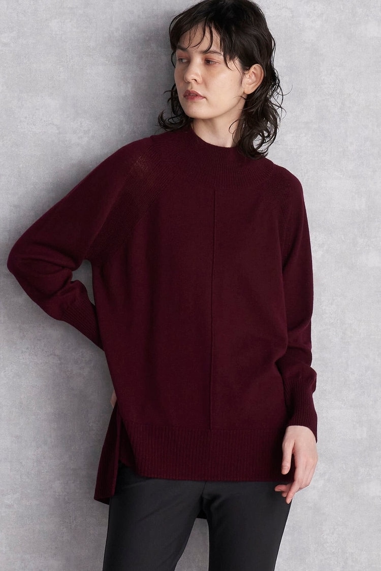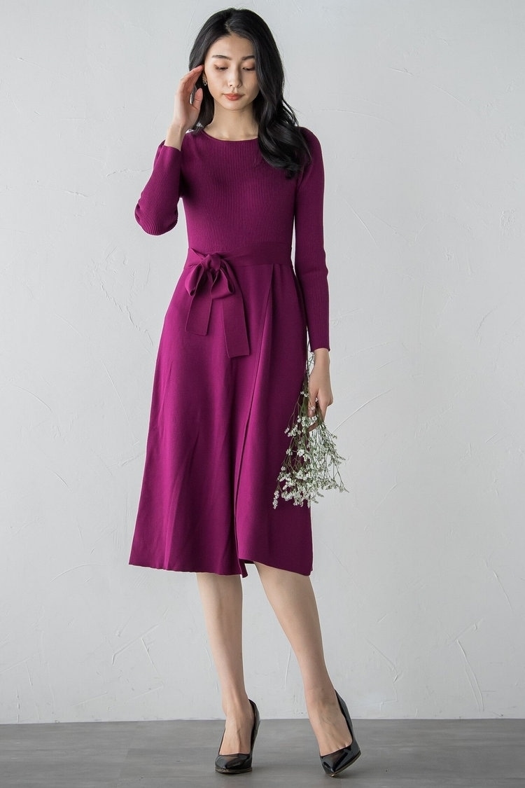 秋になると気になるのが、深みのあるボルドーのアイテム。ワインのようなパープルがかったボルドーなら、大人の気品と女性らしさが漂う着こなしが楽しめます。細めのリブ編みで程よく体にフィットするニットワンピースは、スカートがラップ風デザインになっているのがポイント。ウエストをリボンでマークすれば、スタイルアップ見えも◎。垢抜け見えを狙うなら、ヒールパンプスを合わせ、抜け感を出すのがポイントです。