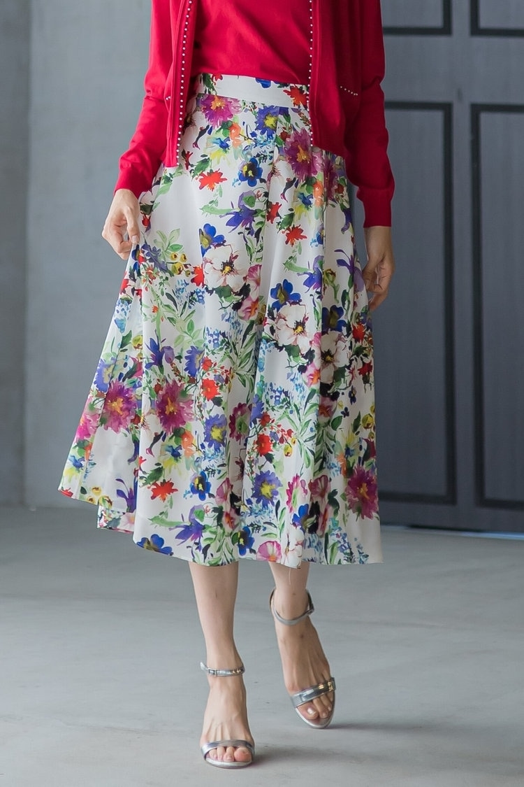 パール付き赤アンサンブル×花柄スカートで華やかに