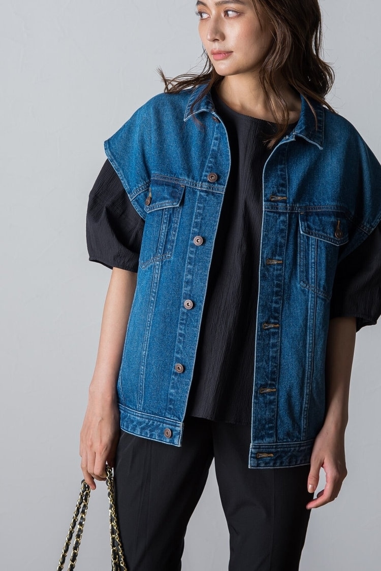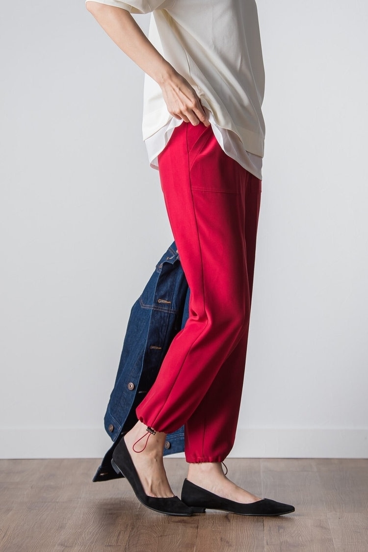 大人カジュアルで活躍するのが、ラフすぎずカジュアルすぎない“きれいめパンツ”。今年らしい着こなしを楽しみたい人は、真紅のベイカーパンツを取り入れてみて。さらりと履けるうえ、大きめのポケットやセンタープレス、裾のドロスト仕様でカジュアルにもきれいめにも着こなせます。デニムベストでカジュアル要素を足したら、繊細なチュールの透け感をアクセントに。キャップ、パンプスを合わせれば、ワンランク上の大人カジュアルが完成します。