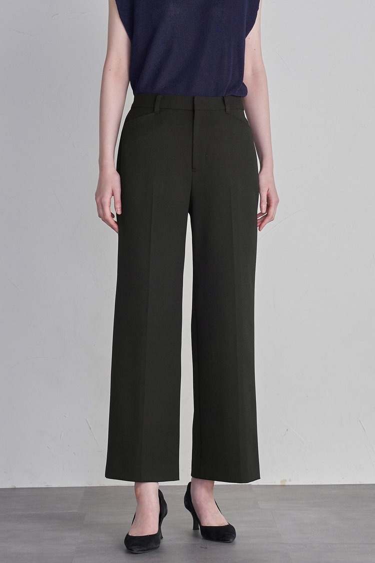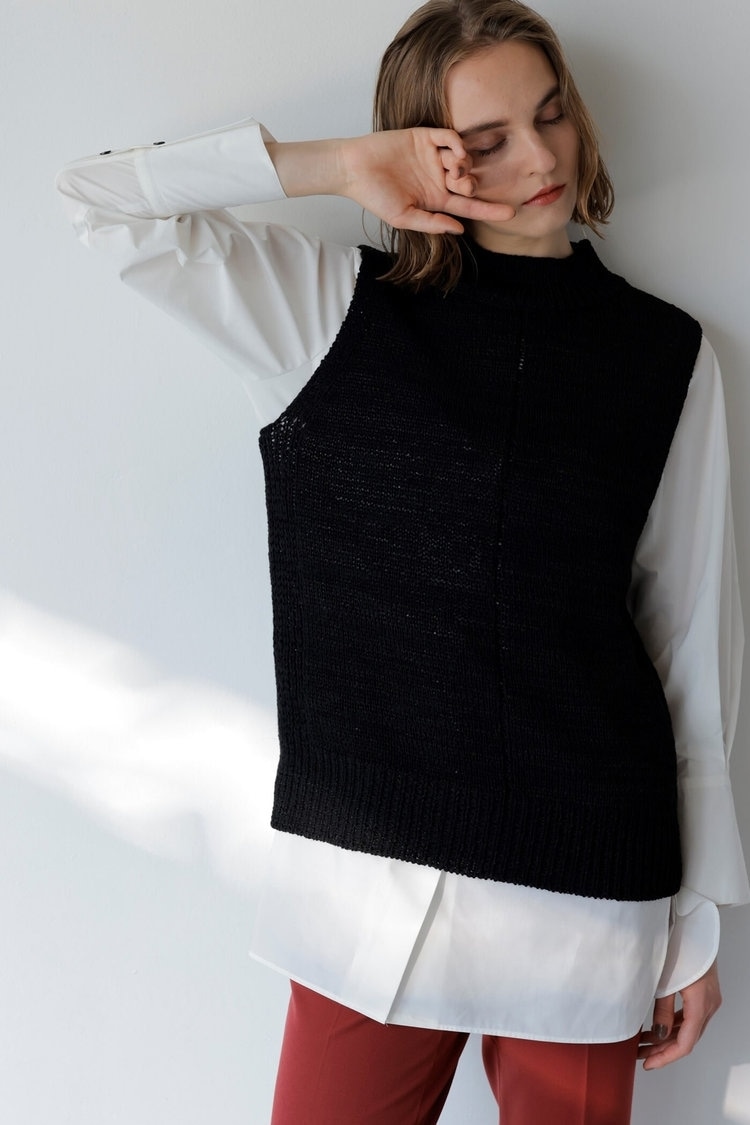 2022年大注目の“レンガ色”ワイドパンツを差し色にしたコーデは、シャツ&ベストでプレッピーな味付けを。パンツは落ち感のある素材で、すっきりとしたレッグラインに見せてくれる効果も期待できます。程よいゆとりのある白シャツ、ネックが詰まった大人ベストを合わせることで、きちんとした印象に。シャツはフロントインし、テール部分を少しチラ見せすることでコーデに遊び心が加わります。足元はヒールパンプスでシャープに仕上げて。