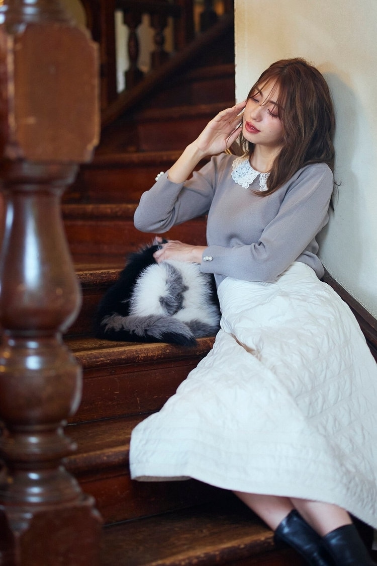 本格的な秋が到来するまでの時期は、ニットのアンサンブルが大活躍。今年はぜひはっきりとした赤のアンサンブルを選んでみて。カーディガンの襟ぐりから前立て部分には、小さなパールが連なってさりげなく華やかに。女性らしい雰囲気の花柄スカートを合わせれば、ドラマティックな秋の赤コーデが完成します。思い切り女性らしい着こなしを楽しむなら、まろやかカラーの小物を合わせ、よりフェミニンに寄せて。