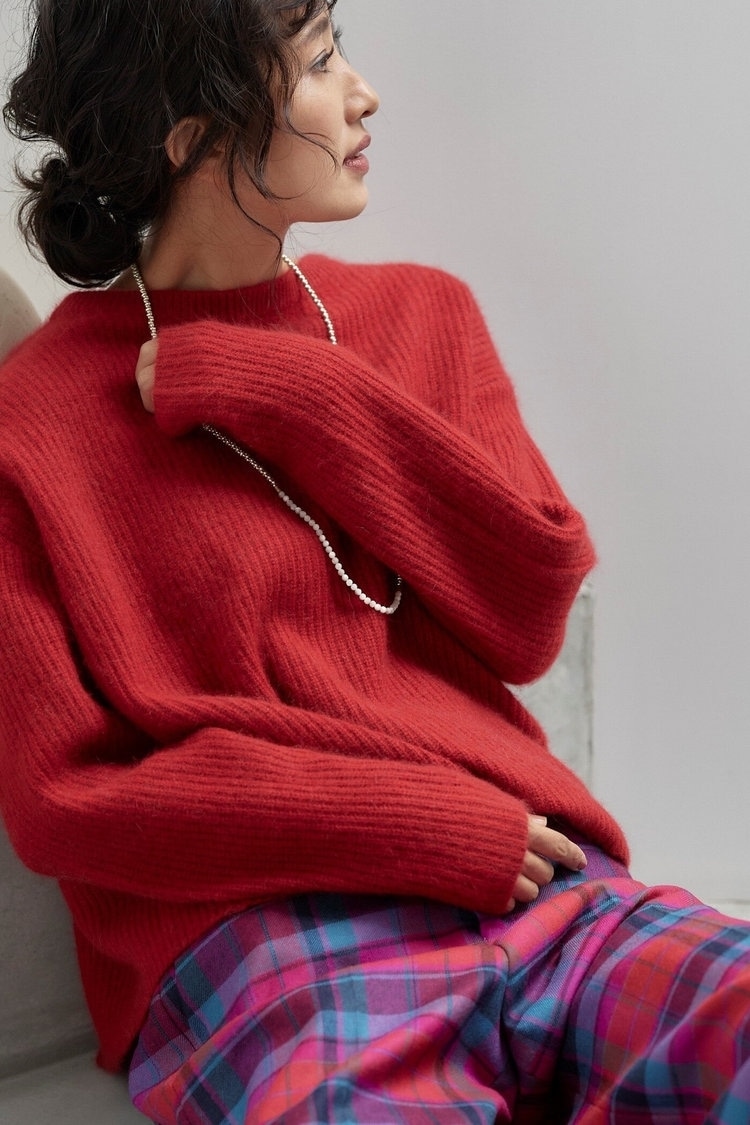 定番のシンプルなニットは何枚持っていても便利なアイテム。ベーシックなカラーもいいけれど、トレンドを意識するなら流行色の「赤」をチョイスしてみて。暗くなりがちな冬コーデも、華やぎカラーを加えるだけでパッと明るい印象に。チクチクしない素材のニットなら、乾燥する冬でも快適に過ごせます。ボトムスには同系色のチェックパンツを合わせ、トレンドをとことん意識してみて。動きやすく、子育て中のママにもおすすめのコーデです。