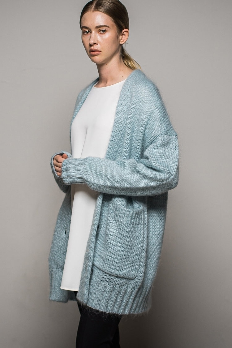 モノトーン×ブルーのざっくりカーディガンで女性らしく