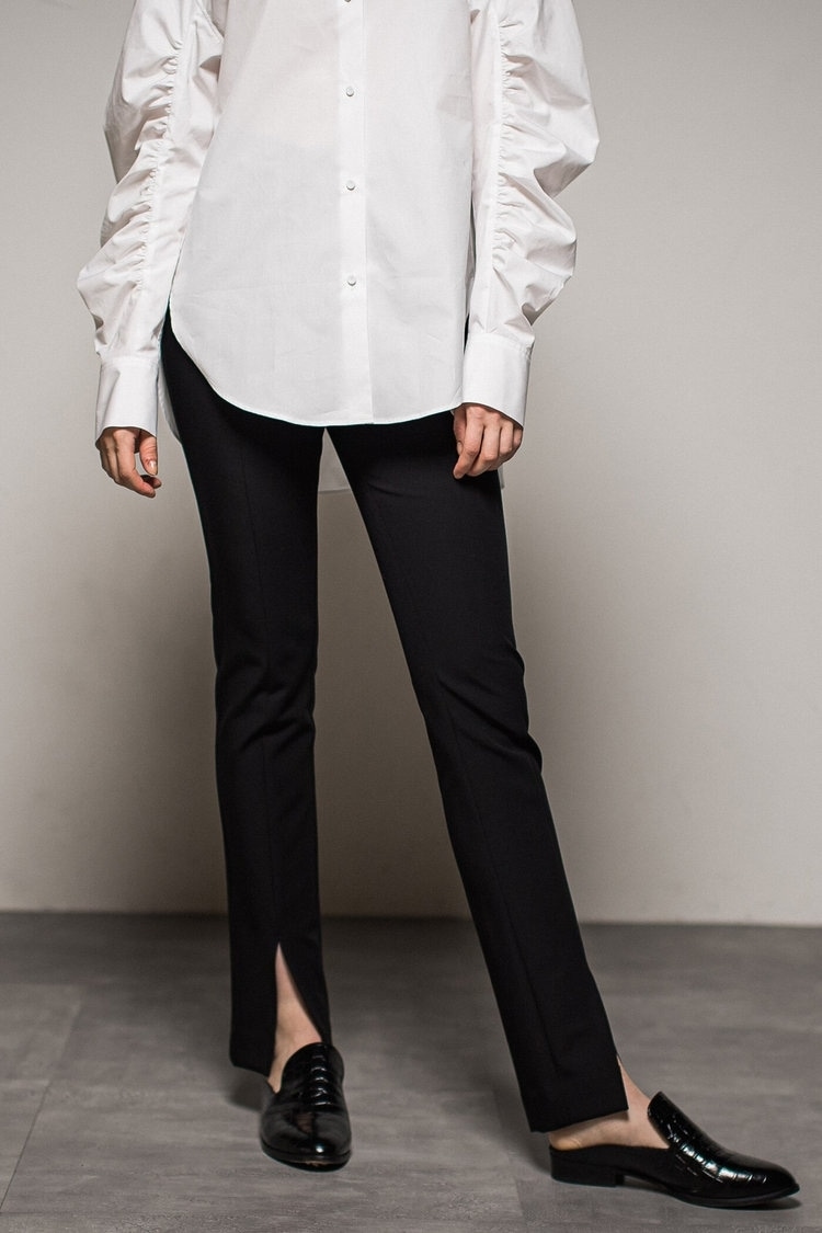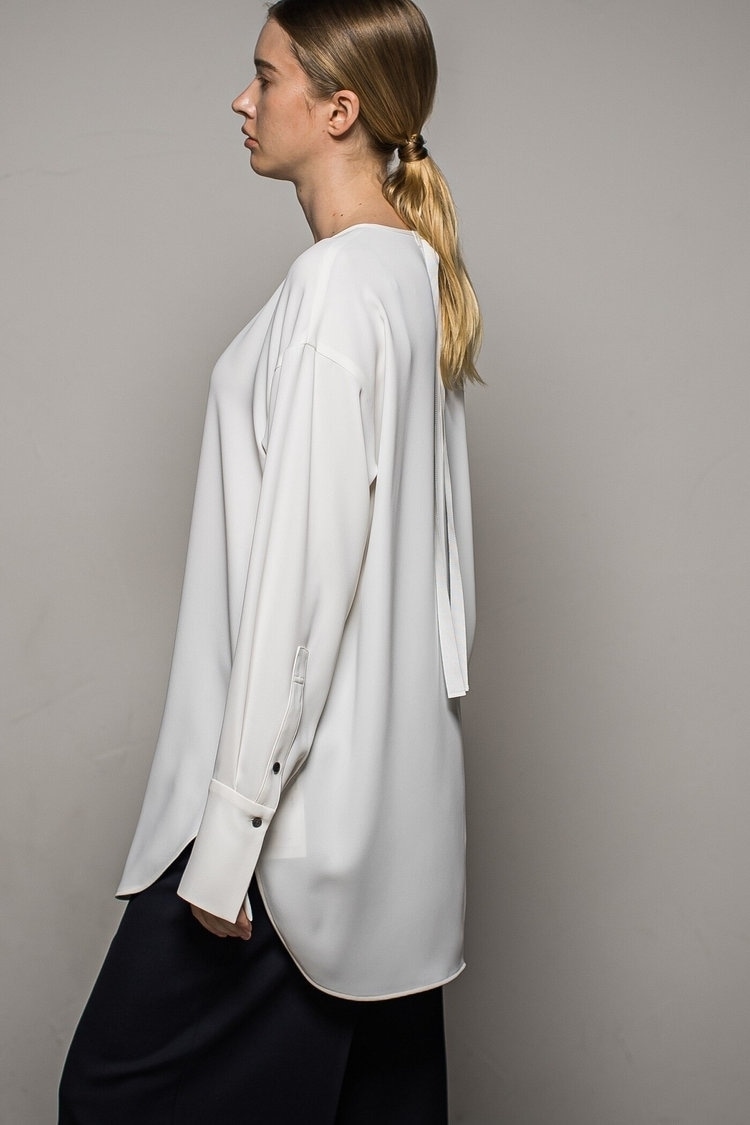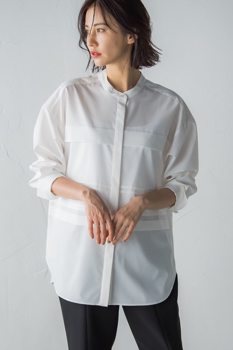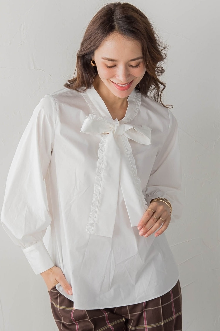 シンプルながら1枚でも着映えするブラウスは冬のマストアイテム