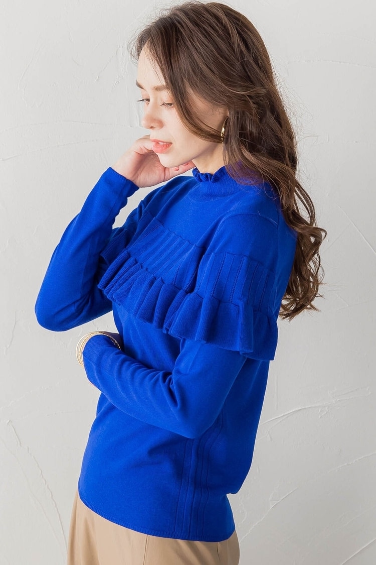 2022年の注目カラー「ロイヤルブルー」は、ニットで取り入れるのがおすすめ!コーデに1点投入するだけで、程よく華やか&上品な雰囲気のスタイリングが楽しめます。フェミニン派の40代女性におすすめなのが、ぐるりと施されたフリルが美しいデザインニット。サイド部分がリブ編みになっているから、スタイル良く見せてくれる効果も期待できます。ブルーと相性の良いベージュのエコレザースカートを合わせれば、暗くなりすぎない冬コーデの完成。