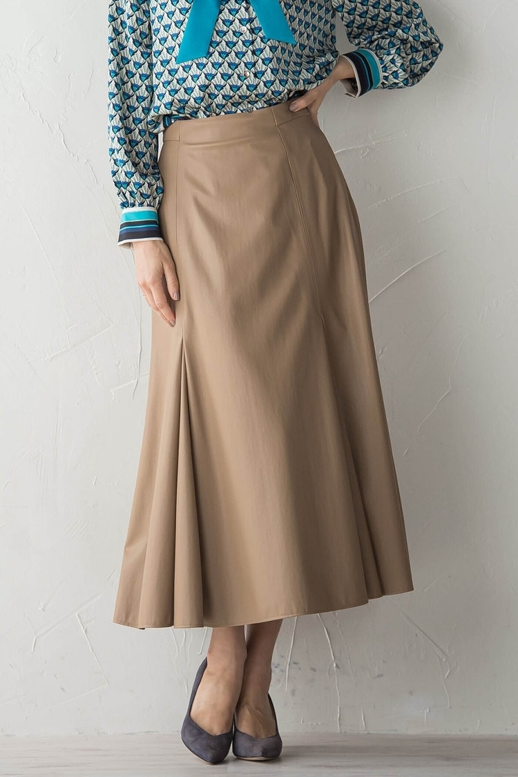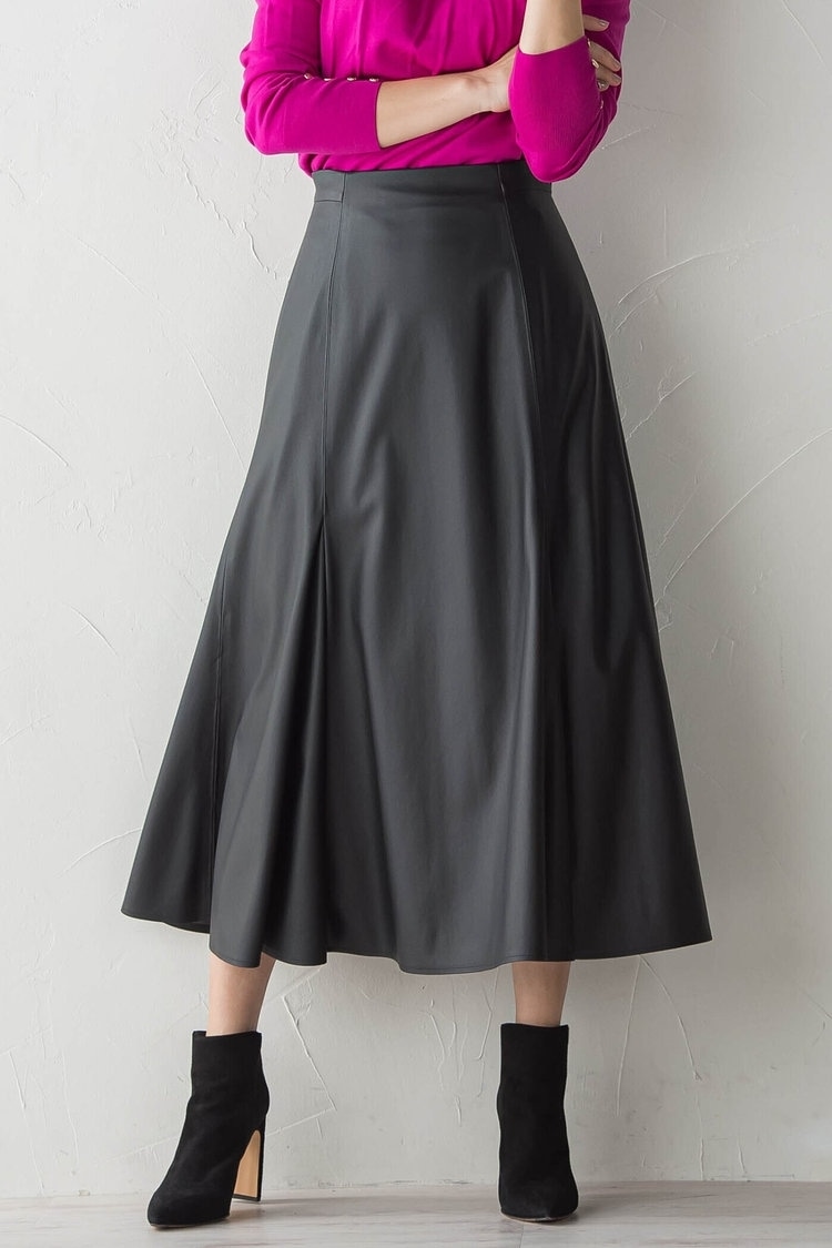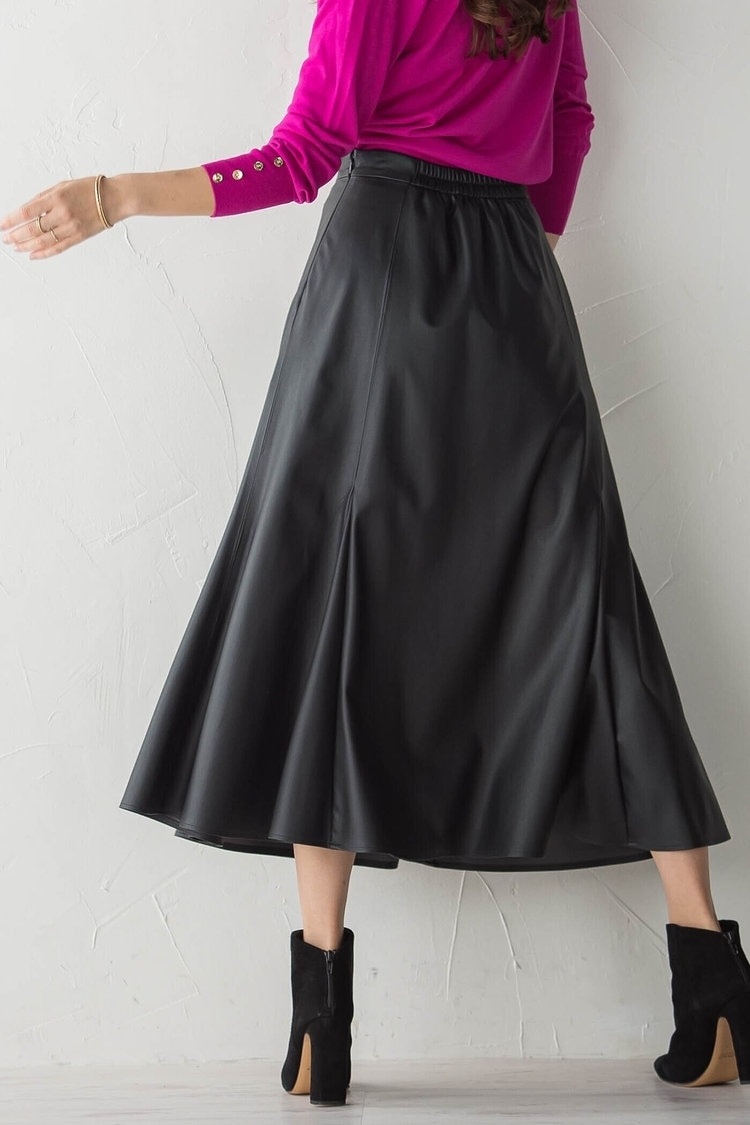 秋冬になると魅力的に映るレザー素材のスカートも、フレアシルエットならこんなにエレガントに!やわらかくしなやかな素材なので、ハードすぎない印象で着られるのがうれしい。身体にフィットしすぎないマーメイドシルエットで、足さばきも着心地もばつぐん。ピンクのFOXカシミヤニットと合わせれば、甘辛&大人キュートな印象の冬コーデを楽しめます。足元はブーツやパンプスなど、レディな印象のシューズが好相性。