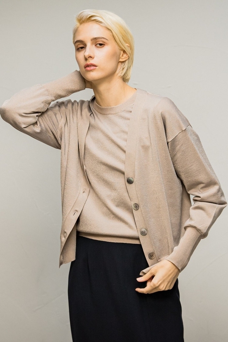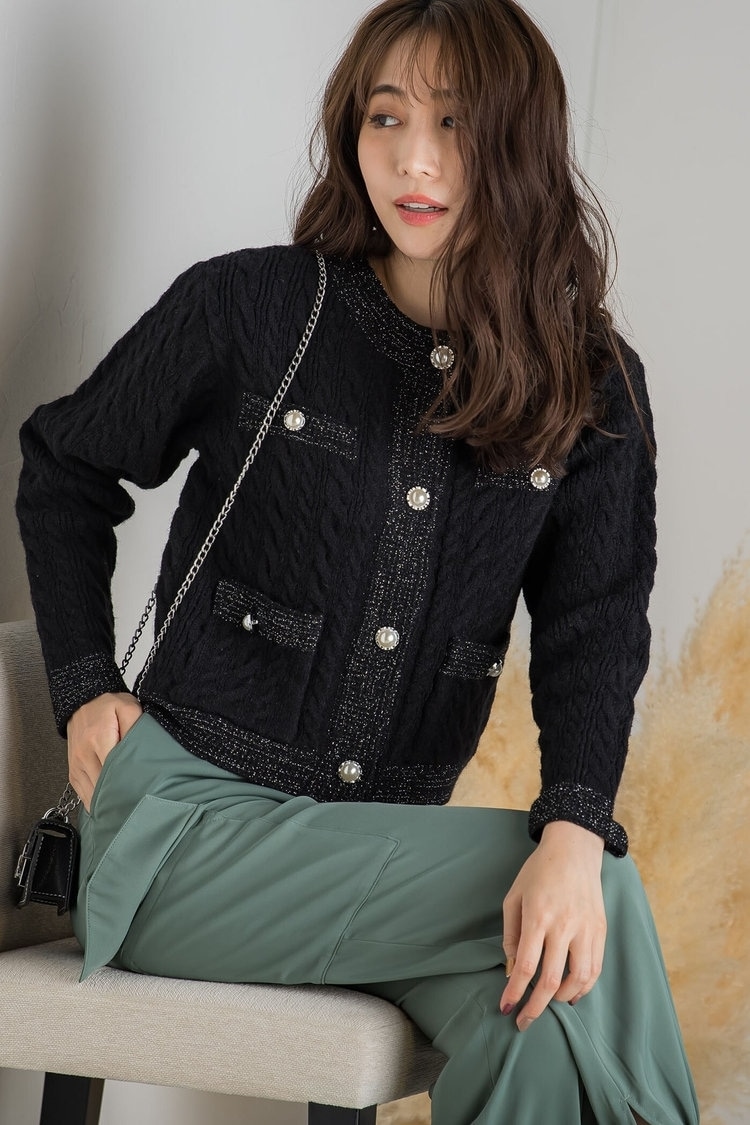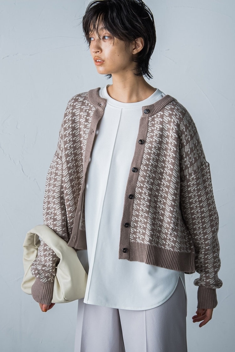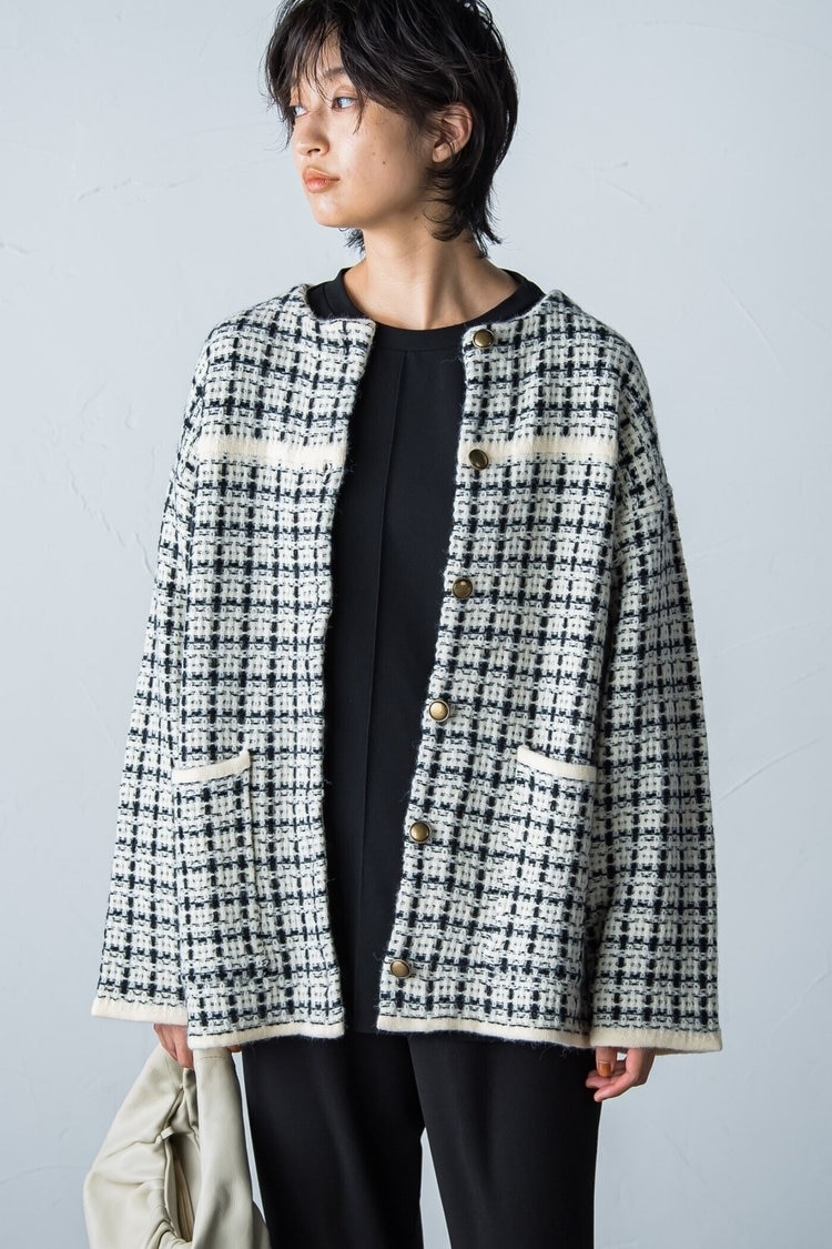 「2022年トレンドのツイードが気になるけれど、かっちりしすぎるとコーデに取り入れにくそう」という人におすすめなのが、ツイード風に仕立てたニットカーディガン。ジャケットよりも肩肘張らず着られて、かつクラシカルな雰囲気をプラスできます。抜け感のあるゆったりシルエットも◎。ストレートパンツはもちろん、デニムなどのカジュアルアイテムとも相性ばつぐんです。大人っぽく仕上げたいときは、全身をモノトーンでまとめて。